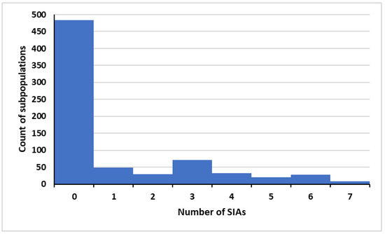 Histogram of bOPV pSIAs in the 720 model subpopulations with intensification *. Abbreviations: bOPV, bivalent OPV, pSIA, preventive supplemental immunization activity. * Pakistan and Afghanistan 6 pSIAs (low coverage areas 7 pSIAs), most of the Democratic Republic of the Congo, Nigeria, and Ethiopia 2–3 pSIAs (low coverage areas 4–7 pSIAs), most of India 3 pSIAs (high-risk areas, including UP and Bihar, 5–7 pSIAs), most of Somalia and South Sudan 2 pSIAs (low-coverage areas 7 pSIAs), most of Ukraine 4 pSIAs (high-risk areas 6 pSIAs), Yemen and Papua New Guinea 6 pSIAs, most of Indonesia 1 pSIA (low coverage areas 3–4 pSIAs), most of the Syrian Arab Republic 1 pSIA (low coverage areas 2–3 pSIAs), most of Bangladesh 3 pSIAs (low coverage areas 5 pSIAs), Côte d’Ivoire, Mauritania, Egypt, and Haiti 4 pSIAs, Philippines 3 pSIAs, 3–4 pSIAs in low-coverage areas in modeled subpopulations that include countries such as: Albania, Algeria, Angola, Armenia, Azerbaijan, Benin, Bosnia and Herzegovina, Botswana, Burkina Faso, Burundi, Cambodia, Cameroon, Central African Republic, Chad, Comoros, Congo, Djibouti, Dominican Republic, El Salvador, Equatorial Guinea, Eritrea, Eswatini, Ethiopia, Gabon, Gambia, Georgia, Ghana, Guatemala, Guinea, Guinea-Bissau, Haiti, Honduras, Kazakhstan, Kyrgyzstan, Kenya, Lao People’s Democratic Republic, Lesotho, Liberia, Libya, Madagascar, Malawi, Mali, Mauritius, Montenegro, Morocco, Mozambique, Myanmar, Namibia, Nicaragua, Niger, Papua New Guinea, Philippines, Republic of Moldova, Rwanda, Senegal, Serbia, Sierra Leone, Somalia, State of Palestine, Sudan, Tajikistan, The Former Yugoslavian Republic of Macedonia, Togo, Tunisia, Turkmenistan, Uganda, Ukraine, United Republic of Tanzania, Viet Nam, Zambia, and Zimbabwe. The global model includes some of these countries due to risks posed by other countries in the same block. Generally, countries with WPV1 R0 ≥ 10 with any levels of coverage would likely benefit from some pSIAs (e.g., the inclusion of pSIAs in India and Bangladesh), and all countries with subpopulations with coverage less than <60% would likely need 3–4 pSIAs. The model does not provide refined estimates of the number of pSIAs and may not fully account for differential decreases in coverage that occurred during COVID-19 and persist in some countries.