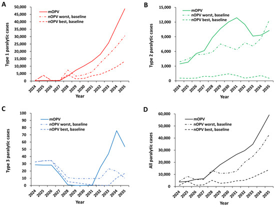 Figure 2 shows the expected values of the paralytic polio cases for the model time horizon for the baseline from the prior study (i.e., mOPV) [48] and for the new baselines (i.e., nOPV best and nOPV worst). The prior baseline assumed some continued bOPV pSIAs that did not actually occur and assumed mOPV2 use for oSIAs for the full-time horizon [48]. As shown in Figure 2, the baseline expected total cases for types 1 and 2 for the nOPV best and nOPV worst scenarios reflect: (i) the removal of previously modeled bOPV pSIAs for 2022 and 2023 [48], which did not actually occur, (ii) the inclusion of some tOPV and mOPV2 oSIAs that did occur, and (iii) the shift to nOPV2 for most oSIAs in 2022 and 2023. Figure 2A shows a somewhat higher overall expected burden of type 1 cases from 2024–2027, although these remain relatively low as long as bOPV use continues in RI and oSIAs. This occurs because the model includes oSIAs with bOPV for any type 1 outbreak prior to bOPV cessation, in addition to its use in RI and any pSIAs included for 2022–2027 in the polio-endemic countries of Pakistan and Afghanistan. Similar to prior modeling [48], the implementation of bOPV cessation in 2027 without additional bOPV pSIAs shows a rapid and substantial increase in expected type 1 paralytic polio cases. Figure 2B shows the expected number of annual type 2 cases. Since the introduction of nOPV2 starts in 2022, the expected cases for type 2 with oSIAs that use mOPV, nOPV best, or nOPV worst already differ in 2024. Figure 2B shows a much lower expected number of type 2 cases if nOPV2 exhibits unrealized properties similar to those modeled for the nOPV2 best bound, but the expected cases do not go to zero. The low expected number of type 3 paralytic cases shown in Figure 2C reflects the outcome of a relatively small fraction of stochastic iterations with any type 3 poliovirus transmission. Combining the expected cases for the scenarios in Figure 2D shows the dominance of the expected type 1 cases due to its relatively greater transmissibility and neurovirulence. Notably, the baseline scenario leads to increasing use of bOPV oSIAs to manage cVDPV1 outbreaks, and in some subpopulations and iterations, co-circulation of cVDPV1 and cVDPV2 outbreaks that the model manages by prioritizing oSIAs to the first outbreak type observed. The results in Figure 2 continue to reflect the model assumptions related to limited to no improvements in oSIAs and no restart of any preventive OPV use, independent of the burden of disease (i.e., no consideration of reactive policy changes).