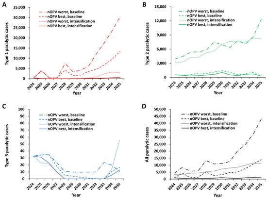 Figure 3 shows the expected annual cases with additional bOPV pSIAs (i.e., intensification) in some model subpopulations to intensify population immunity between 1 January 2024 and 1 May 2027, see Figure 1) compared with the baseline. In contrast with prior modeling [48] and the new baselines (Figure 2), the addition of bOPV pSIAs leads to a substantial reduction in the number of expected cases for type 1, as shown in Figure 3A for the entire time horizon. Overall, the expected number of annual cVDPV1 cases remains relatively low as long as bOPV use continues, but bOPV cessation in 2027 increases the risks of cVDPV1 outbreaks and expected cases after 2027. Due to the change in assumptions about surveillance and oSIA coverage in some high-risk geographies, the results show a less dramatic expected increase in cVDPV1 cases than prior results [48]. As expected, Figure 3B shows that adding bOPV pSIAs does not substantially change the expected annual cases for type 2, with the nOPV best and nOPV worst curves showing similar annual expected cases, although some differences occur due to some iterations with co-circulation. Adding bOPV pSIAs lowers the number of iterations with type 3 transmission and expected cases, and Figure 3C shows similar low expected annual cases compared with Figure 2C. A comparison of the total expected annual cases for the scenarios in Figure 3D shows a substantial improvement over the expected results in Figure 2D.
