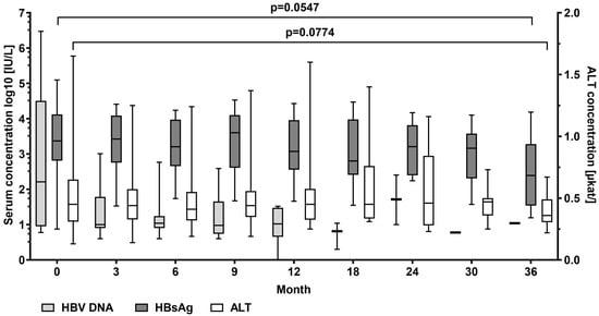 In patients with detectable HBV DNA at baseline (n = 20), mean serum levels of HBV DNA log10 decreased from median 2.19 (0.76–6.47) to 1.04 IU/mL at the end of the observation period. HBV DNA log10 became undetectable in 11 patients. Mean HBsAg log10 levels decreased from median 3.37 (0.88–5.10) to 2.39 (1.20–4.19) IU/mL, p = 0.055. No patient experienced HBsAg loss. Median alanine aminotransferase (ALT) serum levels decreased from 0.45 (0.13–1.65) µkat/L at the start of TAF treatment to 0.36 (0.22–0.67) µkat/L, p = 0.077) at the end of observation (Figure 1).