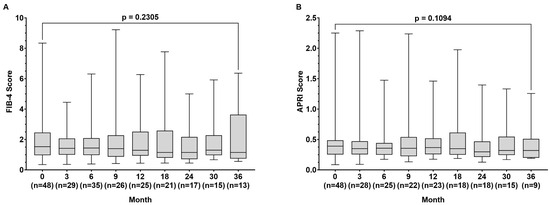 Fibrosis-4 (FIB-4) score (A) and aspartate aminotransferase to platelet ratio index (APRI) score (B) at baseline and at month 3, 9, 12, 18, 24, 30, and 36 during tenofovir alafenamide (TAF) treatment. Wilcoxon test was used to compared baseline values and values at month 36.
