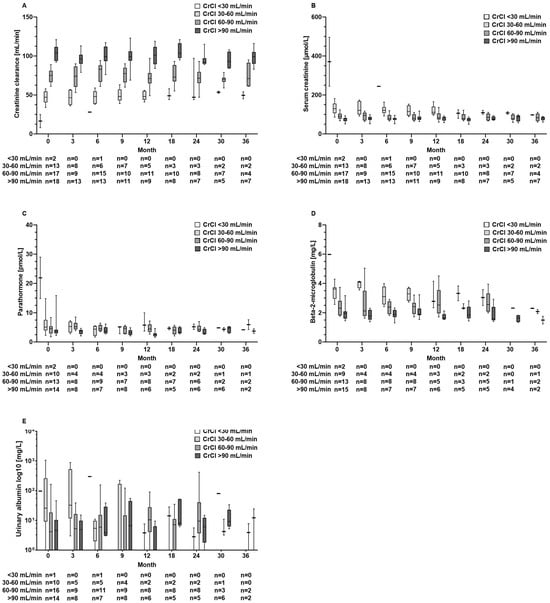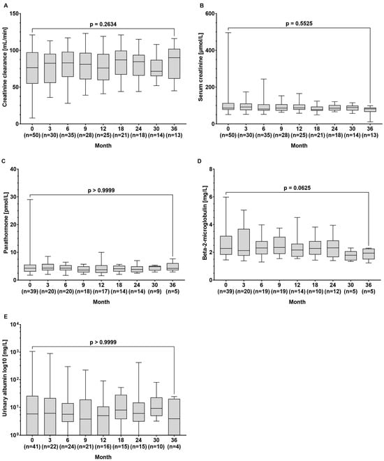 The median creatinine clearance (77 (8–121) vs. 90 (45–116) µmol/L, p = 0.263) and serum creatinine levels (86 (51–496) vs. 82 (21–99) min/L, p = 0.552) remained stable throughout the observation period. Additionally, there were no significant changes in the median concentrations of parathormone (4.30 (1.79–29.0) vs. 4.25 (2.94–7.61) pmol/L, p > 0.999), beta-2-microglobulin (2.28 (1.45–5.98) vs. 1.94 (1.23–2.30) mg/L, p = 0.063), and urinary albumin (5.8 (0–1062) vs. 3.9 (0–24.4) mg/L, p > 0.999) between baseline and the end of observation (Figure 3A–E).