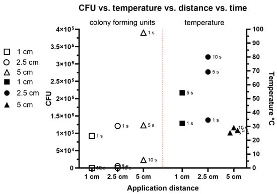 Preliminary study to evaluate the influence of application distance and exposure time on colony-forming units and temperature development. On the left side with white markers are the colony-forming units, with dependency of application distance and exposure time shown. On the right side of the figure, the temperature during the cold plasma treatment with dependency of distance and exposure time is shown. The treatment during this experiment was conducted with air plasma.