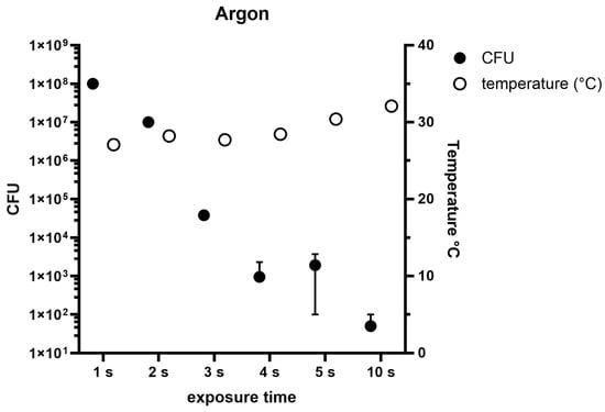 The use of Argon as a cold plasma gas showed after 1 s of exposure time 1 × 108 CFUs (SD: 0 CFUs) (Figure 4). After 2 s, the CFUs were reduced to 1 × 107 counts (SD: 0 CFUs). The CFU counts after 3 s of cold plasma treatment showed 3.8 × 104 CFUs (SD: 8 × 103 CFUs). After 4 s of treatment, 9.43 × 102 CFUs (SD: 1.3 × 103 CFUs) were counted. After 5 s of treatment 1.9 × 103 CFUs (SD: 1.8 × 103 CFUs) were found. At the last treatment duration of 10 s, we found 5 × 101 CFUs (SD: 5 × 101 CFUs). During the experiment, the following temperatures were recorded for the exposure times of 1–10 s: 27 °C (1 s), 28.2 °C (2 s), 27.7 °C (3 s), 28.4 °C (4 s), 30.4 °C (5 s), and 32.1 °C (10 s).
