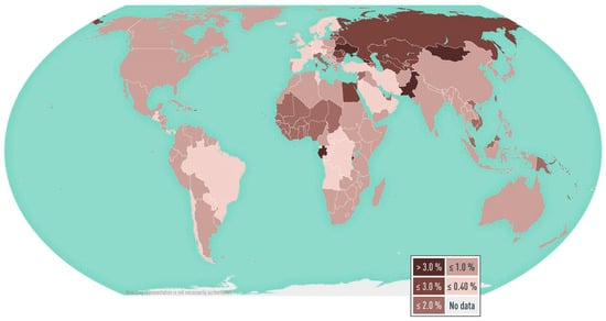 HCV was first identified as a cause of non-A non-B transfusion hepatitis in 1989 []. A homolog of HCV, hepacivirus, was initially identified in dogs in 2011, but was later shown to be widely prevalent in horses []. This is important as it may allow the development of suitable animal models to study HCV, given the inability to use chimpanzees for ethical reasons. There has been an epidemic of HCV in Western countries over the last 100 years []. Natural history and epidemiological studies have shown that global dissemination, particularly of subtypes 1a and 1b, could be an unintended consequence of medical treatments, blood transfusions, and injection drug use during World War II, leading to accelerated spread of the virus. The prevalence of pediatric HCV worldwide is 0.87% [] vs. 2.5% worldwide for adults []. Currently, the mode of transmission in high-income countries is in the ‘at risk’ population, including intravenous drug users who share needles, men who have sex with men, and prisoners. In low-income countries, healthcare-associated transmission, including during invasive procedures, dental procedures, and blood transfusions, remains a frequent mode of transmission []. It is estimated that 40% of new HCV infections are associated with unsafe injections globally []. Although HCV reinfection is low after treatment, it is common in people entering Catalan prison []. The burden of HCV is disproportionately high in low- and middle-income countries (LMIC) []. Regions estimated to have a high prevalence of HCV in the general population (>3.5%) are Central and East Asia; and North Africa/Middle East; those with a moderate prevalence (1.5–3.5%) include South and Southeast Asia; Sub-Saharan Africa; Andean, Central, and Southern Latin America; the Caribbean; Oceania; Australasia; and Central, Eastern and Western Europe; whereas low prevalence []. Figure 1 depicts the global prevalence of HCV.
