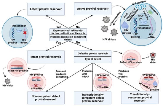 Human Immunodeficiency Virus (HIV) proviral reservoirs are cells that harbor integrated HIV proviral DNA within their nuclear genomes. These cells form a heterogeneous group, represented by peripheral blood mononuclear cells (PBMCs), tissue-resident lymphoid and monocytic cells, and glial cells of the central nervous system. The importance of studying the properties of proviral reservoirs is connected with the inaccessibility of integrated HIV proviral DNA for modern anti-retroviral therapies (ARTs) that block virus reproduction. If treatment is not effective enough or is interrupted, the proviral reservoir can reactivate. Early initiation of ART improves the prognosis of the course of HIV infection, which is explained by the reduction in the proviral reservoir pool observed in the early stages of the disease. Different HIV subtypes present differences in the number of latent reservoirs, as determined by structural and functional differences. Unique signatures of patients with HIV, such as elite controllers, have control over viral replication and can be said to have achieved a functional cure for HIV infection. Uncovering the causes of this phenomenon will bring humanity closer to curing HIV infection, potential approaches to which include stem cell transplantation, clustered regularly interspaced short palindromic repeats (CRISPR)/cas9, “Shock and kill”, “Block and lock”, and the application of broad-spectrum neutralizing antibodies (bNAbs).