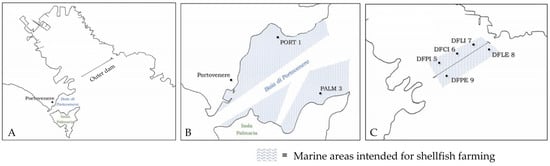 Maps of the study area (A) and the details of the sampling point locations (B,C): PORT 1 (44°3′28.411″ N, 9°50′37.899″ E); PALM 3 (44°3′2.858″ N, 9°51′0.741″ E); DFPI 5 (44°4′21.101″ N, 9°51′31.978″ E); DFCI 6 (44°4′32.61″ N, 9°51′57.409″ E); DFLI7 (44°4′42.352″ N, 9°52′18.278″ E); DFLE 8 (44°4′38.039″ N, 9°52′48.46″ E); DFPE 9 (44°4′12.4″ N, 9°51′45.079″ E).