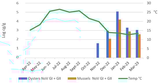 The data were managed and analysed using Stata 17 []. The overall pathogen-specific prevalences, along with the related binomial exact 95% confidence intervals (CIs), were calculated. Similarly, the occurrence of pathogens was calculated according to the mollusc species under study. Comparisons of the prevalence of the viral agents between the oysters and the mussels were conducted using the Pearson’s Chi-squared test. To gain further insight into the occurrence of NoV, the non-parametric Kruskal–Wallis test was employed to compare the viral loads observed in the molluscan specimens from each collection area. Finally, a linear regression model was constructed to assess the relationship between the NoV loads and the study molluscs, as well as the seasonal temperature of the marine water. This was evaluated separately for each NoV genogroup and for the total (GI + GII). The mean, minimum, and maximum NoV loads were calculated for the oysters and the mussels, separately. All the samples used in the calculations passed quality control criteria for extraction efficiency and RT-PCR inhibition. Values below the LOQ were included in the calculations without modification. For all the statistical analyses, the level of significance was set at p < 0.05.