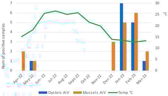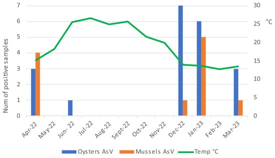 Number of positive samples for AsV in oysters and mussels during one year of monitoring.