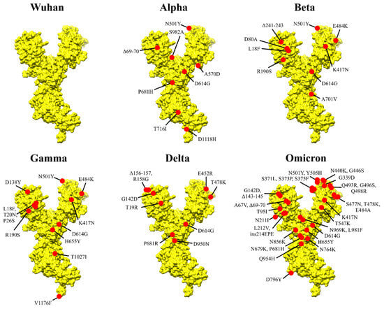 Graphical representation of the Spike protein from different SARS-CoV-2 Variants of Concern. The monomeric Spike from Wuhan ancestral strain is depicted in yellow (PDB: 6VSB), and key mutations are depicted as red dots for Alpha (B.1.1.7), Beta (B.1.351), Gamma (P.1), Delta (B.1.617.2), and Omicron (B.1.1.529). The illustration was prepared with the software Chimera 1.18 (developed by the Resource for Biocomputing, Visualization, and Informatics at the University of California, San Francisco).