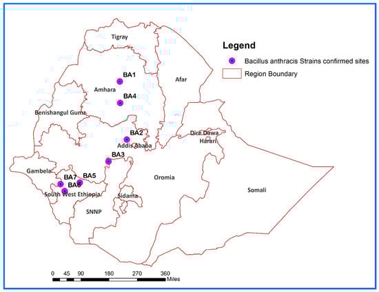 Map of Ethiopia showing the sites where B. anthracis strains were isolated.