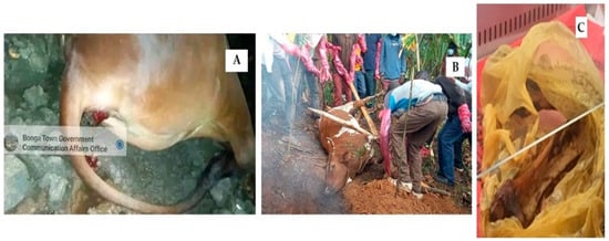 Ox dead of anthrax showing bloody discharge from the anus in Bonga Town (A); burying of a cow dead of anthrax in Deber Work Town, 2023 (B); bones collected following the death of a cow in Ada Berga District (C).