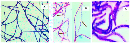 Seven B. anthracis strains were collected from 2019 to 2024 (Table 1) and confirmed using the classical microbiology method and real-Time PCR. All B. anthracis isolates showed microscopically, typical Gram-positive, thick, long, straight bacilli with square or truncated ends with parallel sides found usually single, in pairs, or long chains of bacilli (Figure 3A). By modified Ziehl–Neelsen and malachite green staining, the presence of spores was also demonstrated (Figure 3B). Mucoid colonies were observed, and Giemsa staining was prepared from bicarbonate agar. The bacilli that were stained appeared blue, square-ended rods in short chains surrounded by a pinkish-red capsule (Figure 3C).