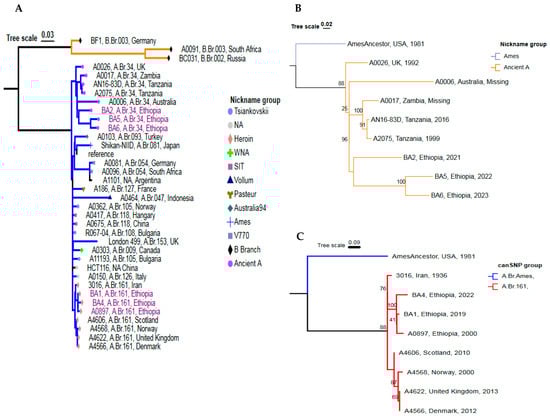 (A) Global phylogeny of 35 B. anthracis strains generated using the SNP Phylogeny (Samtools) Pipeline, with strains grouped by CanSNP classifications as defined [18]; (B) Phylogenetic tree of representatives from the A.Br.034 (Ancient A) CanSNP group, and (C) Phylogenetic tree of representatives from the A.Br.161 (Heroin) CanSNP group. The reference genome used was ‘Ames Ancestor’ (NC_007530.2). Colored tips indicate CanSNP group nicknames, while empty circles represent strains that have not yet been assigned to a genetic group.