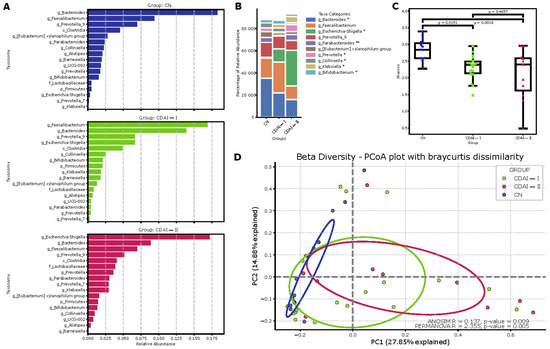 Principal coordinates analysis (PCoA) based on the Bray–Curtis distance (β-diversity) confirmed significant compositional differences between the groups of controls (CN), CD patients in remission or with low disease activity (CDAI-I, <220) and patients with moderate to severe CD (CDAI-II, >220). Statistically significant differences between groups were confirmed by the ANOSIM (R = 0.137, p = 0.009) and PERMANOVA (R = 2.355, p = 0.005) results, indicating significant differences in microbiome composition between the study groups (Figure 3D).