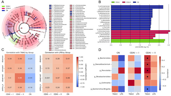 Analysis of microbiome composition, biomarkers, and disease activity. (A) Linear discriminant analysis (LDA) effect size (LEfSe) showing differentially abundant taxa between CDAI-I (mild-to-moderate Crohn’s disease), CDAI-II (severe Crohn’s disease), and CN (healthy controls) groups. The length of each bar represents the log10 transformed LDA score. (B) Heatmap depicting correlations between key bacterial genera and biomarkers (TMAO and LPS) across different disease activity groups. Red indicates positive correlation; blue indicates negative correlation. (C) Alpha diversity metrics (Shannon index, Simpson index, observed species, and Pielou’s evenness) correlated with TMAO levels across disease activity groups. (D) Alpha diversity metrics correlated with LPS levels across disease activity groups. In panels (C,D), the color intensity and size of circles represent the correlation strength, with red indicating positive and blue indicating negative correlations. CDAI: Crohn’s Disease Activity Index; TMAO: trimethylamine N-oxide; LPS: lipopolysaccharide binding protein.