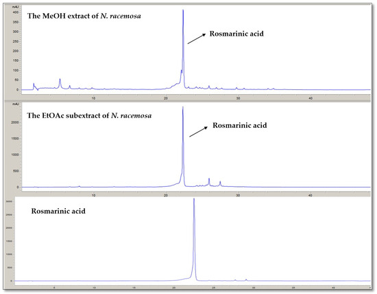 The HPLC chromatograms of the MeOH extract, EtOAc subextract, and rosmarinic acid (330 nm).