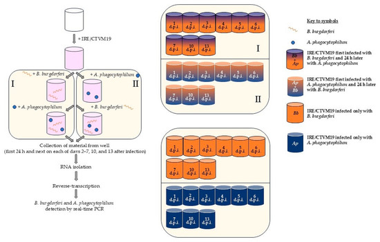 Experimental design schematic (on the left) and diagrams of microplates with individual wells of IRE/CTVM19 tick cell line infected by Borrelia burgdorferi and/or Anaplasma phagocytophilum and sample days after infection (on the right); variants of experiments: I—IRE/CTVM19 cells first infected with B. burgdorferi and after 24 h with A. phagocytophilum, II—IRE/CTVM19 cells first infected with A. phagocytophilum and after 24 h with B. burgdorferi. Abbreviations: d.p.i.—days after infection; Bb—B. burgdorferi, Ap—A. phagocytophilum.
