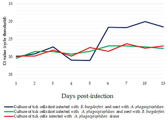 There are important limitations of the present study. Firstly, as preliminary research, the experiments were carried out only on one replicate per treatment—one well per treatment. Performing the experiment in only one repetition does not allow for the evaluation of the precision and the detection of errors. Further studies with more replicates would confirm the results obtained. Preliminary results allowed us to confirm that the methodology is effective and can be used for further research on a broader scale. Additionally, we could not determine the number of bacterial cells or MOI that were used for inoculation of the tick cells. For this reason, the results have been presented as Ct values, which enables only indirect comparison between the numbers of bacteria in different conditions and does not quantify the genome copies of the bacterium. Therefore, these results can only compare between Ct values and allow a relative quantification of bacteria depending on the day post-infection and order of infection.