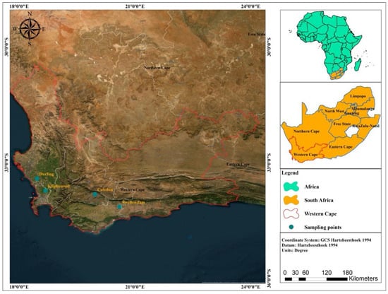 Map showing four sampling locations in the Western Cape region of South Africa.