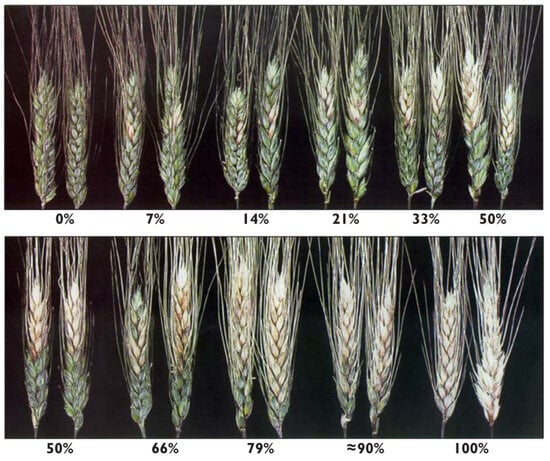 Wheat plants infected with head blight were identified based on visible symptoms on the spikelets, such as discoloration (turning pale or a bleached color, instead of the healthy green or yellow) and kernels that appeared shriveled, smaller, and lighter in weight. Wheat heads exhibiting blight symptoms were subsequently screened for FHB. All wheat spikes from each sampling location were counted and visually inspected for the presence or absence of FHB symptoms. Spikes were recorded as diseased when at least a single spikelet showed any signs of FHB, following the severity scale of Stack and McMullen [29] shown below (Figure 2).