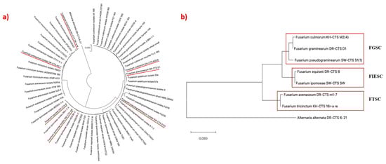 (a) Maximum likelihood phylogenetic analysis of ITS-rDNA sequences showing the relationship between Fusarium isolates with reference sequences from NCBI. The phylogenetic tree shows the relationships of Fusarium isolates causing FHB disease in wheat. The identified Fusarium isolates used in this study are underlined in red. (b) Phylogenetic tree showing relationship between Fusarium isolates in different species complexes (FGSC, FIESC, FTSC) associated with FHB. The sequence of Alternaria alternata DR-CTS 6-21 was used as an outgroup. Keys: FGSC = Fusarium graminearum species complex; FIESC = Fusarium incarnatum-equiseti species complex; and FTSC = Fusarium tricinctum species complex.