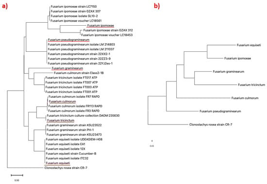 (a) Maximum likelihood phylogenetic analysis of species-specific gene sequences showing the relationship between Fusarium isolates with reference sequences from NCBI. The tree shows the phylogenetic relationships of Fusarium species causing FHB disease in wheat. The identified Fusarium isolates used in this study are underlined in red. (b) Comparative phylogenetic analysis of Fusarium isolates using species-specific gene sequences. The sequence of Clonostacys rosea strain CR-7 was used as an outgroup.