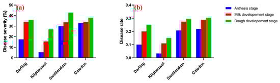 The outbreak of FHB disease depends largely on the environmental and weather conditions which can vary between seasons. The disease severity was measured in each field during the different stages of wheat development, and the results show an increase in the severity and rate of the disease from the pollination to dough stage across the four different fields (Figure 5a,b and Figure 6a,b). Increase in the severity and rate of the disease could be attributed to different climatic factors such as temperature and rain, which favor the outbreak of FHB particularly in wheat [46]. Furthermore, increase in the severity of the disease across the different developmental stages could be due to the type of farming practice (types of crops planted on the field in the previous years). For example, a large amount of within-field maize residue is an FHB risk factor. Therefore, rotational practice involving no-host crops is recommended for FHB management [47,48]. Though we did not quantify the surface residue of FHB in this study, it was also reported that no-till systems typically leave about 30% of the soil surface covered with residue [46]. Besides the farming practice method, the severity of the disease could have been influenced by cultivar resistance and management practices such as fungicide application [49,50]. A major challenge in the management of FHB disease in South Africa is the unavailability of resistant wheat varieties, bio-fungicides, and licensed fungicides to the local farmers [3].