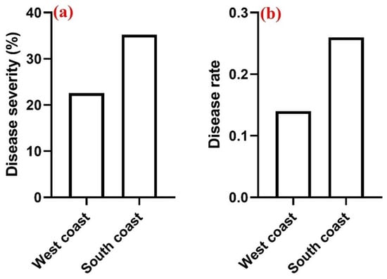 Swellendam in the South coast recorded the highest disease severity (42.73%), followed by Caledon (38.00%), while Klipheuwel and Darling in the West coast had disease severities of 27.00% and 36.00%, respectively, at the dough development stage (Figure 5a). The disease progression at different stages of wheat development was also measured across the four sampling locations, and the results indicate that the dough stage showed the highest disease rate in all locations (Figure 5b). Swellendam and Caledon in the South Coast region showed the highest disease rate (0.3), followed by Darling (0.25) and Klipheuwel (0.15) in the West Coast region (Figure 5b). In addition, both disease severity and rate were higher in the South Coast of the Western Cape (35.22% and 0.26%, respectively) compared to the West Coast (25.56% and 0.14%, respectively) (Figure 6a,b).