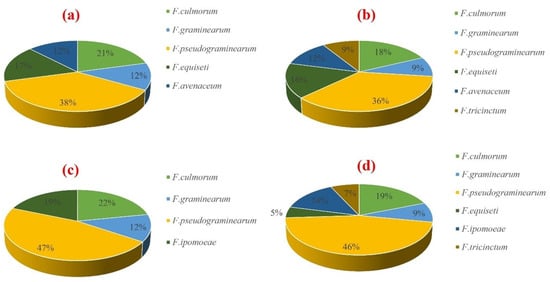 The abundance of individual FHB-related species varied across the different sampling locations (Figure 7a–d), with fewer isolates identified in Swellendam (Figure 7c). F. ipomoeae was identified exclusively in Swellendam and Caledon, in the South coast region, with frequencies of occurrence of 19% and 14%, respectively (Figure 7c,d). On the other hand, F. tricintum was only identified in Klipheuwel and Caledon, with occurrence frequencies of 36% and 46%, respectively (Figure 7b,d). The remaining species including F. culmorum, F. graminearum, F, pseudograminearum, F. equiseti, and F. avenaceum were present in all sampling locations (Figure 7a–d).