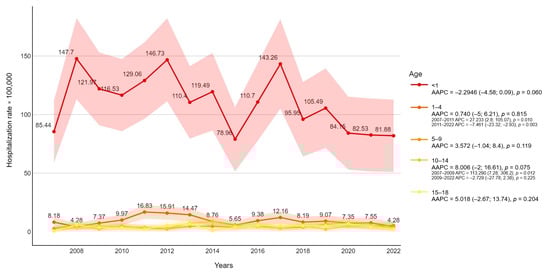 Fungal infection-related hospitalization rate (per 100,000 inhabitants) trends were stratified for age with average annual percentage changes (AAPCs) and 95% confidence intervals.