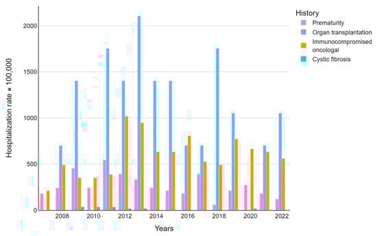 The median annual rates of hospitalization stratified for comorbidities were 242,424/100,000 for patients with a history of prematurity; 140,3509/100,000 for people with a history of organ transplantation; 596,491/100,000 for patients with an onco-hematological history; and 26,315/100,000 for persons with a history of cystic fibrosis (Figure 3). For all patients with comorbidities, the hospitalization rate was significantly higher (p-value < 0.015) than those who did not present with comorbidities.