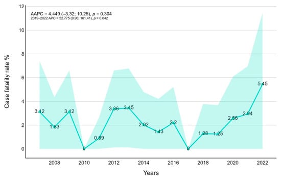 The overall case fatality rate (CRF) was 2.094% (30 patients, p-value < 0.0001) lower for children < one year old (0.820), and higher for patients between 10 and 14 years old (4.403%). Mortality was significantly higher during the COVID-19 pandemic rather than in the previous years (3483 versus 1867). Overall, the Joinpoint regression found no trend (AAPC = 4.45, 95%CI −3.32; 1025); however, the 2019–2022 APC resulted in significant positive results (52.78, p-value = 0.042), highlighting a fast growth in CFR after 2020 (Figure 5).