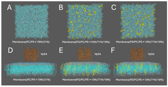 Structure preparation for computational modeling of membrane–Vp54 interactions. (A–C) Top views of the three membrane models used in the study: (A) a zwitterionic membrane composed of PC and PE (79%/21%), (B) a membrane with 10% PG evenly distributed within a PC/PE (71%/19%) background, and (C) a membrane with 10% PS evenly distributed within a PC/PE (71%/19%) background. (D–F) Side views of the corresponding systems with Vp54 (brown) placed above the membrane surface. PG and PS are colored yellow in panels (B,C,E,F). The membrane is shown in cyan, with anionic lipids highlighted in yellow. Vp54 proteins are shown in orange.