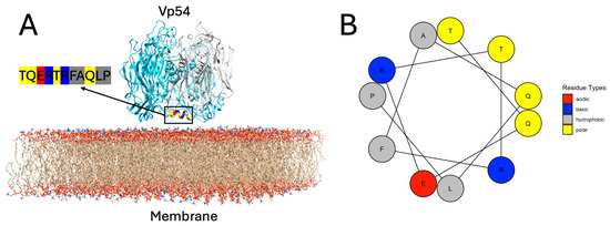 To evaluate the structural properties of the membrane-proximal region of Vp54, a helical wheel projection was constructed for residues 213–223 (TQERTRFAQLP). In Figure 3A, the residues from one representative chain are shown in gray, while the other two chains are colored in cyan, to enhance clarity and focus on the structural features of a single helix. This projection visualizes the spatial distribution of side chains within this α-helical region. The six residues, T213, Q214, R218, F219, L222, and P223, are oriented toward the membrane-facing side of the helix, forming a chemically heterogeneous but spatially contiguous interface. The projection revealed a well-defined amphipathic organization, with most of the polar and charged residues (T213, Q214, and R218) clustering on one side of the helix, and hydrophobic residues (F219, L222, and P223) aligning on the opposite face. Among these, T213 and Q214 are polar, uncharged residues capable of forming hydrogen bonds with lipid headgroups. R218 is positively charged and may contribute electrostatic interactions with negatively charged lipid components. F219, L222, and P223 are hydrophobic and likely engage with the acyl chain region of the bilayer. This spatial arrangement reflects a typical amphipathic α-helix (Figure 3B), in which polar and charged residues are exposed to the aqueous or lipid headgroups, while hydrophobic residues interact with the interior of Vp54. The hydrophobic moment (μ) was calculated to be 6.63, indicating strong segregation of hydrophobic and hydrophilic residues. This level of amphipathicity is characteristic of α-helices that associate with membrane surfaces through selective side-chain partitioning [57].