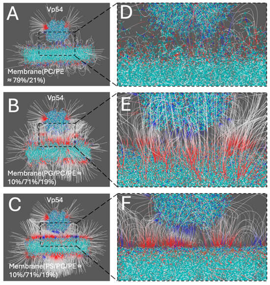 To evaluate the relative strength and spatial orientation of electrostatic interactions between Vp54 and membranes of different compositions, electric field lines were calculated for each system using DelPhiForce C++ V. Beta 1. Figure 5A–C shows the side views of three membrane–Vp54 complexes, consisting of (A) PC/PE (79%/21%), (B) PG/PC/PE (10%/71%/19%), and (C) PS/PC/PE (10%/71%/19%). In each case, Vp54 was placed 20 Å above the membrane surface in a non-contacting orientation to get a better visualization. Figure 5D–F provides zoomed-in views of the membrane surface region corresponding to each system. The density of electric field lines provides an intuitive visual indicator of the strength of electrostatic interactions: higher line density corresponds to stronger electrostatic forces acting between the membrane and Vp54. In the PC/PE system (Figure 5A,D), the field lines are sparse and disorganized, indicating weak and diffuse electrostatic interactions. By contrast, the PG- and PS-containing systems (Figure 5B,C,E,F) exhibit markedly denser and more coherent field lines, particularly in the region directly beneath Vp54, suggesting stronger and more focused electrostatic attraction. These observations align with electrostatic potential surface analysis (Figure 4) and provide spatial evidence that anionic lipid enrichment enhances the electrostatic pull experienced by Vp54. Together, these field line visualizations reinforce the conclusion that electrostatic interaction strength is lipid-composition-dependent, and that PG and PS facilitate stronger and more directed attraction toward Vp54 than zwitterionic membranes.