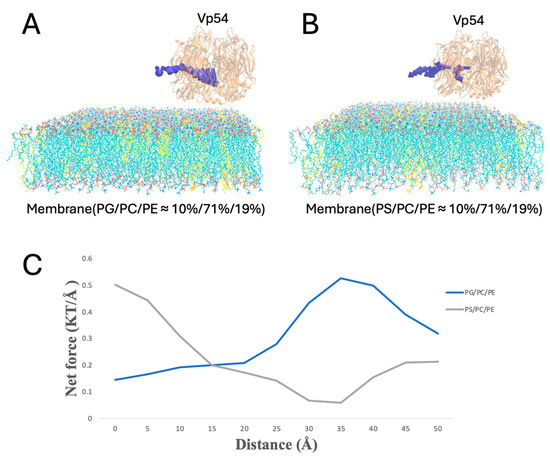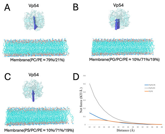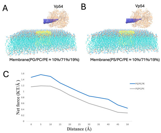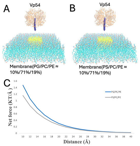 To further investigate the interaction differences between the membranes and Vp54, DelPhiForce C++ V. Beta 1 [52,53] was used to calculate the electrostatic forces for different complex membrane systems [64,65,66]. DelPhiForce is a widely used computational tool for evaluating electrostatic interactions in biomolecular systems. It calculates electrostatic forces by solving the PBE as shown in Equation (2). In this study, the Vp54 was separated from different membranes at varying distances using StructureMan [67]. Specifically, Vp54 was positioned at vertical distances ranging from 10 to 40 Å (2 Å increments) above the membrane center to avoid direct contact while capturing long-range electrostatic effects. Electrostatic forces were then calculated at each separation. To assess the impact of lipid heterogeneity, PG or PS lipids were clustered at the membrane center, and Vp54 was fixed above this enriched region while its vertical position was varied over the same range. Lateral dependence was further examined by holding Vp54 at a constant height (20 Å) and shifting it laterally across the membrane plane (0–50 Å at 5 Å increments), with electrostatic force directions shown as blue arrows. Finally, when PG or PS were clustered at the membrane center, Vp54 was again held at 20 Å above the bilayer and shifted laterally across the membrane plane from 0 Å to 50 Å at 5 Å increments. The directions and strengths of the total electrostatic force were displayed with VMD [63].