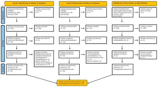 In this systematic review PubMed was searched using two search strategies (search #1 and search #2) shown in Table S1. Last PubMed search was on 19 July 2025. The review targeted toxoplasmosis cases across diverse classes of biologics or small molecules targeted immunotherapies, using both the drug class names and specific drug names in these classes. The list of the 106 individual biologic agents or small molecules searched is shown in Table S2. The reference lists of the included articles were also screened. We followed the PRISMA guidelines of reporting. The PRISMA checklist is shown in Table S3. This systematic review is registered in the Open Science Framework (OSF) Registry of the Center for Open Science (https://osf.io/jz2fy/; accessed on 18 September 2025).