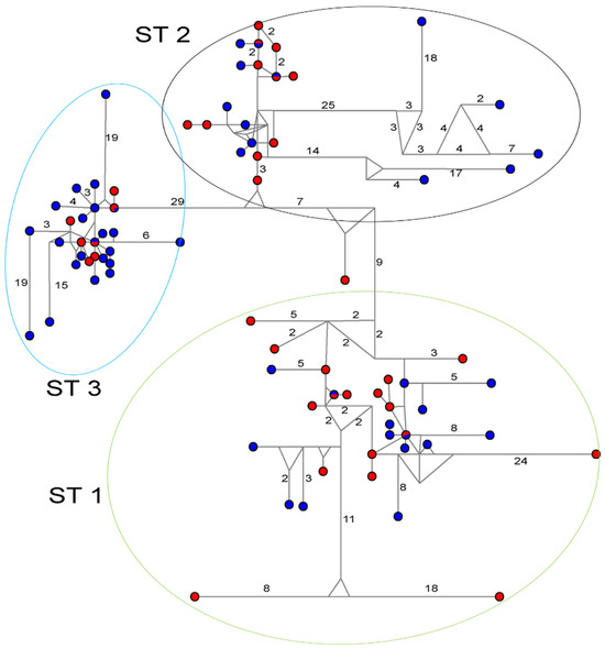 The haplotype network analysis corroborated the phylogenetic findings, with sequences clustering into specific groups corresponding to each of the STs (Figure 2). While this analysis similarly failed to differentiate between case and control haplotypes, it revealed identical haplotypes shared between symptomatic and asymptomatic carriers across all subtypes.