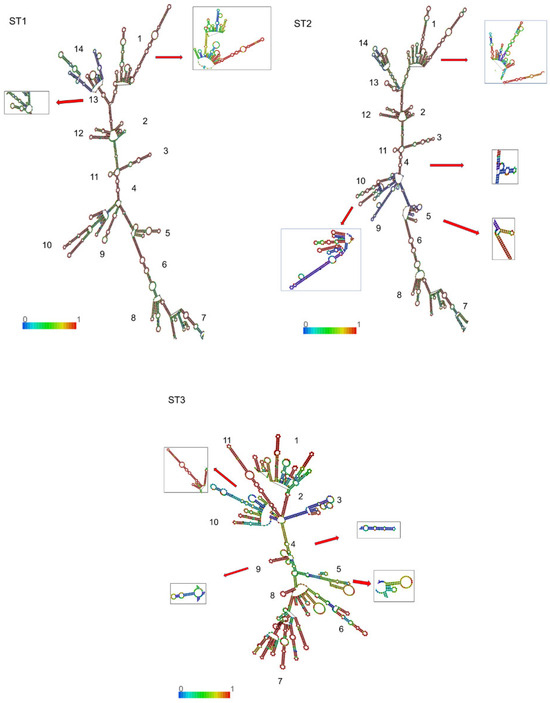 Inferred secondary structures of 18S-rRNA for ST1, ST2, and ST3; the structures are colored by base-pairing probabilities. The numbers at the bases of the branches show the ordering of the substructural loops. The colored line at the base represents the base-pair probability. Polymorphic conformational substructures are shown in boxes. The ΔG values of the thermodynamic ensemble ranged from −587.42 to −1192.10 Kcal/mol for ST1, from −541.50 to −577.10 Kcal/mol for ST2, and from −556.72 to −553.45 Kcal/mol for ST3.