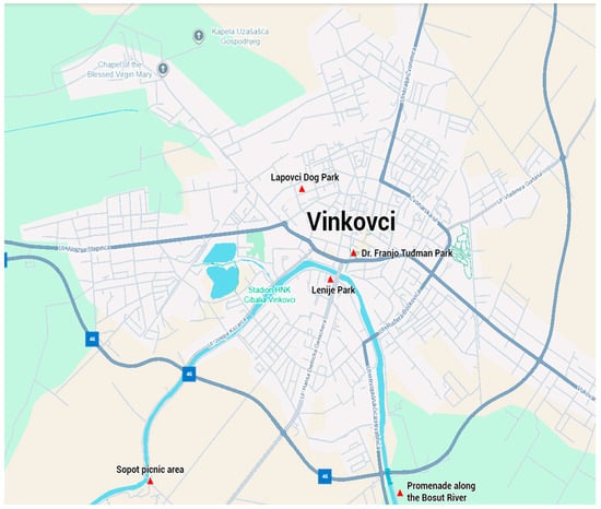 The city of Vinkovci lies on the right bank of the Bosut River, one of the main water bodies of the area [28]. The city and its surroundings are predominantly flat, with extensive arable land and large pedunculate oak (Quercus robur L.) forests. Tick sampling was carried out at five localities. The first locality is Dr. Franjo Tuđman park (45°17′13″ N, 18°48′7″ E) located in the city center of Vinkovci. The park is dominated by grassy areas that are regularly maintained and contains woody vegetation throughout. The second locality is Park Lenije (45°17′01″ N, 18°47′51″ E), a Monument of Park Architecture covering about 4 ha with grassy areas and woody species (around 770 trees). The third locality is a dog park located in the Lapovci city district (45°17′48″ N, 18°47′45″ E), a fenced and regularly maintained park surrounded by residential buildings. The fourth is the Bosut River promenade (45°13′52″ N, 18°48′39″ E), a recreational area with meadows, a children’s park, gazebos, and riparian vegetation. The fifth site is the Sopot picnic area (45°15′57″ N, 18°46′19″ E) on the city outskirts, dominated by meadows and forest edges, often visited by people with dogs (Figure 2).