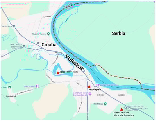 The city of Vukovar is located at the confluence of the Vuka and Danube rivers. Tick sampling was conducted at three sites. The first is Adica Forest Park (45°21′10″ N, 18°58′21″ E), about 2 km from the city center, consisting of mixed trees with numerous footpaths, bordered by marshy areas of the Vuka River. The second locality is the Mazda Park (45°20′38″ N, 19°0′13″ E) with many deciduous and coniferous tree species. The third locality is a mixed acacia (Robinia pseudoacacia L.) forest near the Memorial Cemetery of the Victims of Homeland War (MCVHW), (45°18′47″ N, 19°01′06″ E) (Figure 3).