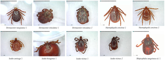 - Hornok, S.; Sándor, A.D.; Beck, R.; Farkas, R.; Beati, L.; Kontschán, J.; Takács, N.; Földvári, G.; Silaghi, C.; Meyer-Kayser, E.; et al. Contributions to the Phylogeny of Ixodes (Pholeoixodes) canisuga, I. (Ph.) kaiseri, I. (Ph.) hexagonus and a simple pictorial key for the identification of their females. Parasites Vectors 2017, 10, 545. [Google Scholar] [CrossRef]