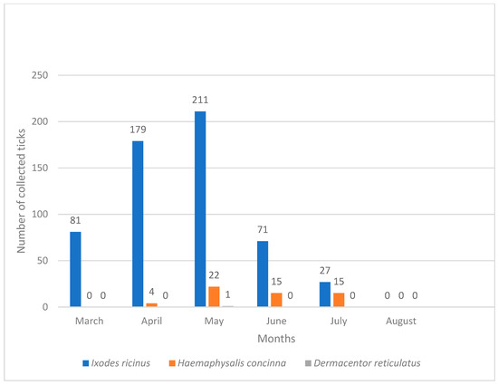 Seasonally, I. ricinus was most abundant, most likely due to its high adaptability [47], with a peak in May in Osijek and Vukovar, consistent with previous regional studies [48]. In Vinkovci, I. ricinus abundance decreased from March to May, similar to patterns observed in Budapest [49]. Haemaphysalis concinna was active from mid-April to late July, peaking in May, slightly earlier than its usual Central European peak in June [50]. Rhipicephalus sanguineus s.l. showed peak activity in May, whereas in Goiânia, State of Goiás (Brazil), adults exhibited four activity peaks per year [51]. D. reticulatus peaked in March, consistent with patterns reported in Budapest and in earlier studies from eastern Croatia [34,49]. In this study, D. reticulatus was the fourth most abundant species, despite being the second most common tick in many parts of Europe [14,52,53]. Dermacentor reticulatus is well adapted to colder environments and seasons and hence is common in autumn and winter months [52]. This study does not extend into autumn and winter months, which could explain the lower number of this tick. Only a few I. hexagonus and D. marginatus specimens were collected, all in April, limiting meaningful comparisons with literature data and preventing reliable assessment of their seasonal activity.