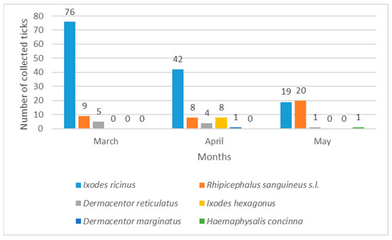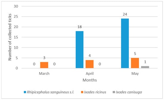Indoor ticks in Vinkovci and Vukovar belonged to I. ricinus and R. sanguineus s.l., while in Osijek only I. ricinus was found. Tick numbers differed significantly between habitats in Osijek (χ2 = 1568.4, p < 0.05), Vinkovci (χ2 = 60.87, p < 0.05), and Vukovar (χ2 = 47.24, p < 0.05). The lower values of H = 0.070 and S = 0.038 in Osijek, as well as H = 0.108 and S = 0.060 in Vukovar, indicate lower tick diversity, while the higher values of H = 0.604 and S = 0.328 for Vinkovci indicate higher tick diversity. Seasonally, 85.37% of ticks were collected in spring (March–May) and 14.62% in summer (June–August). In Osijek, peak abundance was in May (37.38%) and the lowest in August (0.0%) (Figure 5). In Vukovar, most ticks were collected in May (54.54%), while in Vinkovci, March had the highest abundance (46.39%) (Figure 6 and Figure 7).