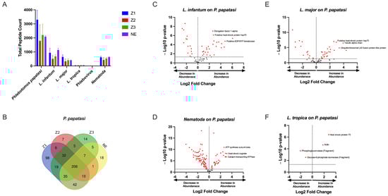 Protein Content Analysis of P. papatasi from Four Moroccan Localities. (A) Total number of identified peptides in P. papatasi samples across four Moroccan localities. (B) Venn diagram illustrates the shared and unique peptide among P. papatasi populations from the studied localities. (C–F) Volcano plots displaying the differential abundance of identified pathogen-associated peptides compared to P. papatasi proteins. Locality abbreviations: Z1, Errachidia; Z2, Imintanout; Z3, Zagora; NE, Marrakech.