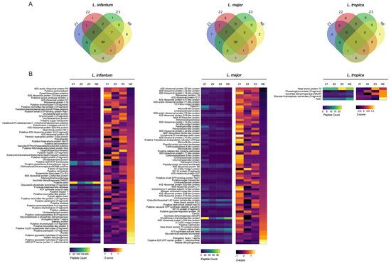 Quantitative Proteomic Profiles of P. papatasi for Leishmania Across Different Moroccan Localities. (A) Relative expression levels of Leishmania species proteins obtained from mass spectrometry analysis (L. major, L. infantum, L. tropica databases) using biological triplicates for each locality (n = 3) and analyzed with Mascot (version 2.6) and Scaffold (version 4.8) software. (B) Heat map representing quantitative proteomic profiles, generated using Z-scores without normalization and clustered based on protein sets with positive Z-scores. Locality abbreviations: Z1, Errachidia; Z2, Imintanout; Z3, Zagora; NE, Marrakech.