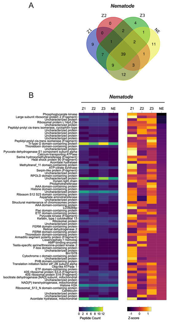 Quantitative Proteomic Profiles of P. papatasi for Nematodes Across Different Moroccan Localities. (A) Relative expression levels of Nematodes proteins obtained from mass spectrometry analysis using biological triplicates for each locality (n = 3), analyzed with Mascot and Scaffold Software. (B) Heat map representing quantitative proteomic profiles, generated using Z-scores without normalization, and clustered based on protein sets with positive Z-scores. abbreviations: Z1, Errachidia; Z2, Imintanout; Z3, Zagora; NE, Marrakech.