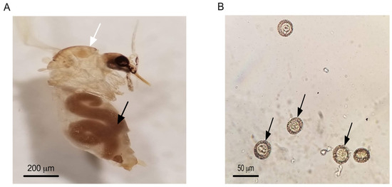 Female of P. sergenti from Imintanout locality infected with a single female. Tetranematidae. Black arrow pointing to Tetranematidae, white arrow pointing to P. sergenti (A) Eggs of a Tetradonematidae isolated from P. sergenti in Morocco. Arrows pointing to Tetradonematidae eggs (B).