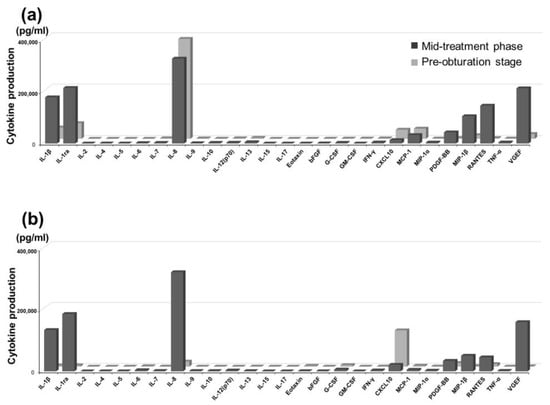 Longitudinal analysis revealed dynamic changes in cytokine expression during treatment. A comparison of the mid-treatment and pre-obturation stages demonstrated variable expression patterns, with particularly large shifts observed in IL-1β, IL-1ra, IL-8, CXCL10, MCP-1, MIP-1β, PDGF-BB, RANTES, and VEGF (Figure 2a,b).
